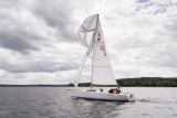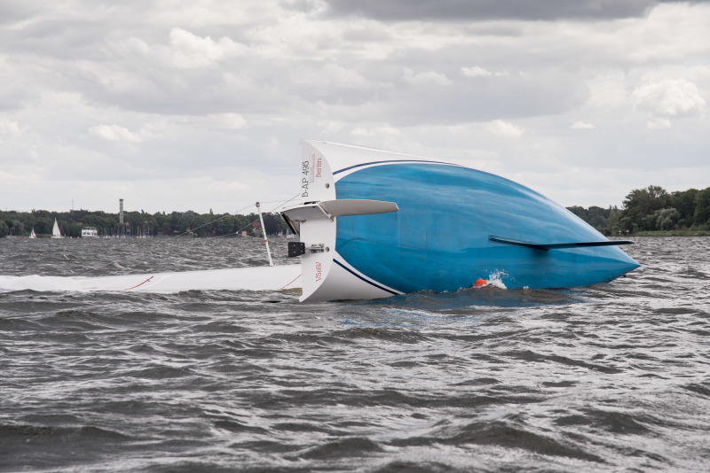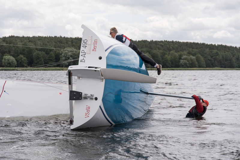 Die Schlussfolgerung hinsichtlich Aufrichten bzw. Bergen des Bootes ist schwieriger. Martin hat nach alter 470er Manier sich von Unten ans Schwert gehängt und das Boot wieder aufgerichtet. Das funktionierte gut und schnell, aber er hatte nach dem Aufrichten den Kontakt zum Boot verloren. Ohne Fotografenschlauchboot wäre das lebensgefährlich. Man kann auch nicht von Oben aufs Schwert steigen und kommt erst recht nicht vom Schwert wieder zurück aufs Deck. Ohne Assistenz ist es wohl sicherer, das Boot durchkentern zu lassen, sich draufzusetzen und auf Hilfe zu warten.